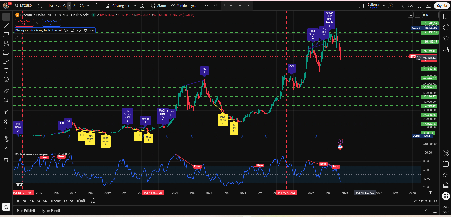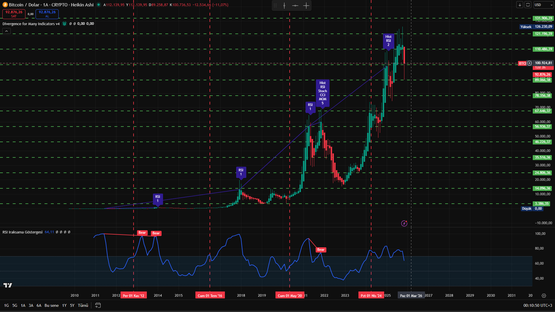 2025 Kasım itibarıyla Bitcoin grafiğinde en güçlü ayı sinyallerinden biri olan multi-indikator bearish divergence (çoklu ayı uyumsuzluğu) görülüyor. Fiyatta yeni zirve oluşurken: